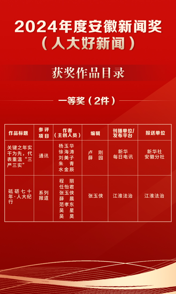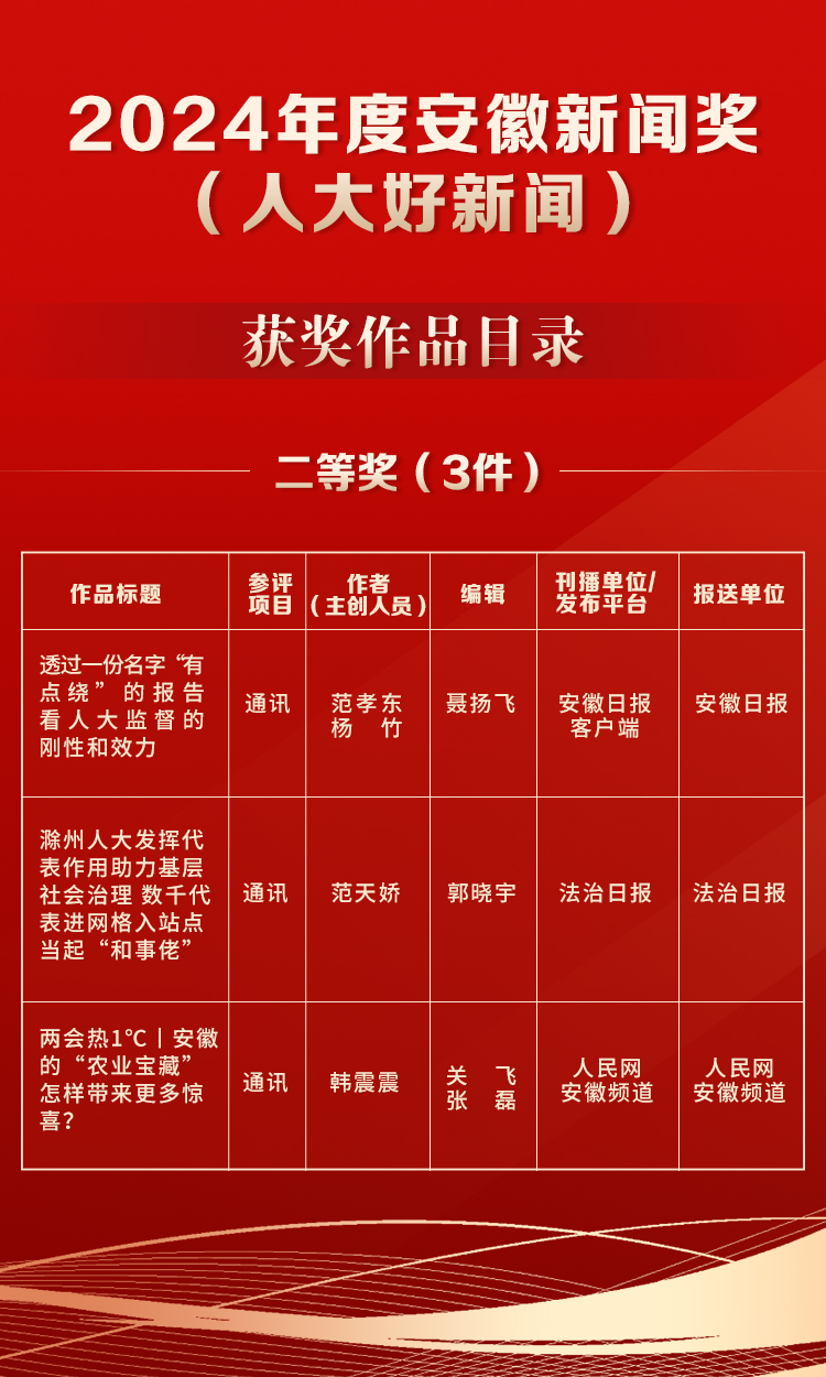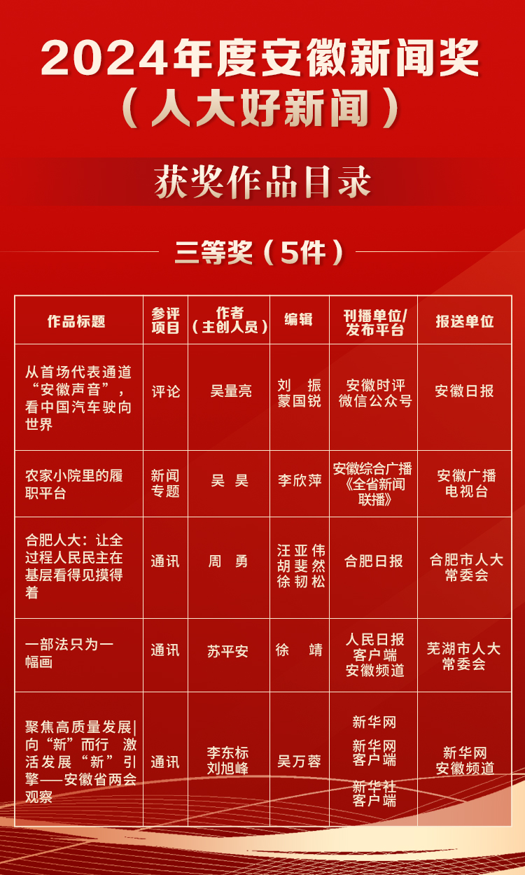 近日,安徽省新闻工作者协会印发了《关于2024年度安徽新闻奖评选结果的通报》,公布了10件2024年度安徽新闻奖(人大好新闻)获奖作品名单,其中一等奖2件、二等奖3件、三等奖5件。