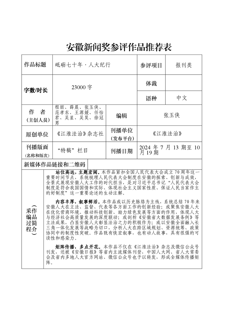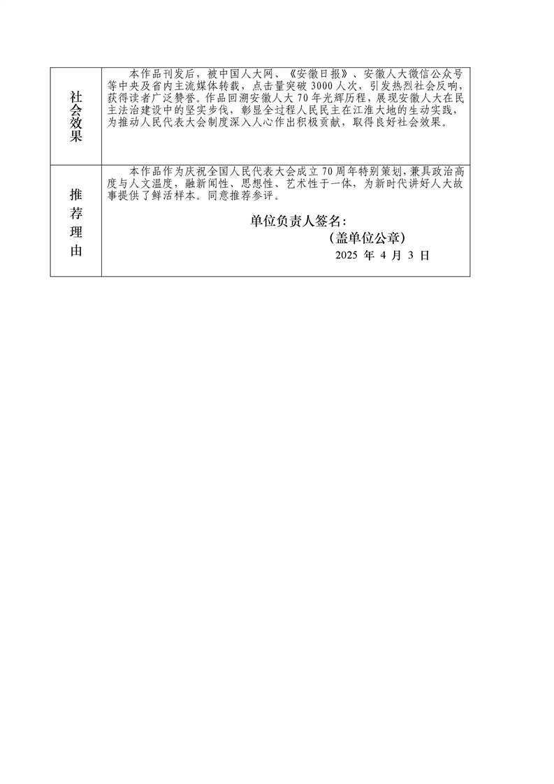 安徽新闻奖参评作品推荐表(砥砺七十年·人大纪行)